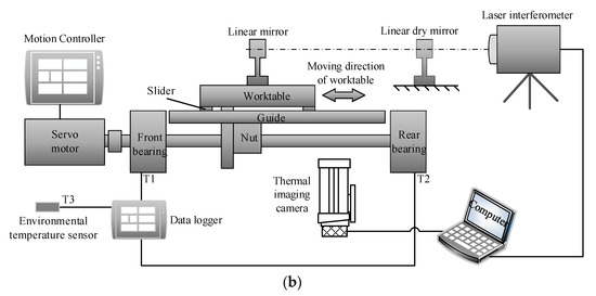 In order to study the thermal characteristics of the ball screw feed system under different working conditions, the experimental equipment is shown in Figure 1. In the experiment, the program was programmed by a motion controller (TC55V) to make the nuts run for 240 min in different operating intervals at a feed rate of 10 m/min. The experimental parameters are shown in Table 3. Due to supporting bearings and bearing seats at both ends of the feed system, the length of the effective stroke is not the full length of the screw shaft, and the actual starting motion coordinate of the ball screw nut pair is at the position of 100 mm. The Pt100-type temperature sensors (with ±0.1 °C accuracy) are used to measure the temperature changes of key points, and the GL840 data logger is used to collect and record the temperature in real-time. The Pt100-type temperature sensor was calibrated before use. The temperature sensor is arranged on the surface of the front bearing (T1) and the rear bearing (T2) by using one component RTV (Room Temperature Vulcanized) Silicone (Ausbong, 189). A sensor is arranged around the test bench to measure the ambient temperature (T3). The specific arrangement position is shown in Figure 2. After the operation, the temperature of the screw shaft is measured by the ThermoVision A40M thermal imaging camera. The uncertainty of the thermal imaging camera is ±2%, and the emissivity is set to 0.95. The temperature distribution of −40~500 °C can be obtained, and the detection accuracy can be as low as 0.08 °C.