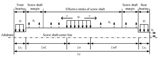 where q1 is the heat generation rate at the front bearing, q2 is the heat generation rate at the rear bearing, and q3 is the heat generation rate at the nut. κ is the thermal conductivity of the screw shaft. Tf is the ambient temperature. h1 is the forced convection heat transfer coefficient on the surface of the screw shaft; and h2 is the convective heat transfer coefficient of the end face of the screw shaft.