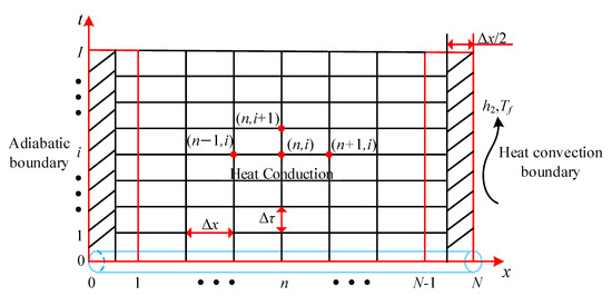 In order to solve the differential equation of heat conduction, the screw shaft is discretized into a grid according to the time step Δτ and the space step Δx, as shown in Figure 5. The intersection point in the graph, such as (n, i), represents a specific “time-space” node position. In order to facilitate the calculation of the node temperature value, is used to represent the current temperature of the node, and is used to represent the temperature of the node at the next time.