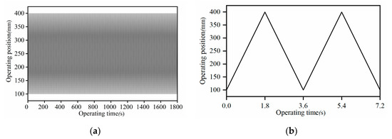 - The operating interval, operating time, and feed rate are determined to match the actual working conditions. The defined nut heat source operating time is the total time of the feed system, which is the same as the actual working process of the feed system. When the movement of the ball screw nut pair is stopped, the heat will no longer be generated by the feed system. For example, in the operating interval of 100~400 mm and operating at a feed rate of 10 m/min for the 1800 s, the function diagram between the nut heat source position and operating time during operating is shown in Figure 6a. Due to the fast operating speed and short operating interval, the function diagram is very dense. Figure 6b is an enlarged diagram of the function between the nut heat source position and the operating time. For different operating intervals and feed rates, the above parameters and diagrams must be recalculated and drawn.