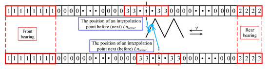 - The divided grid is parameterized, and the heat generation rate of the corresponding grid position is determined. The front bearing area is set to “1”, and the front bearing heat generation rate q1 is applied; the rear bearing area is set to “2”, and the heat generation rate q2 of the rear bearing is applied. The area is centered on the nut center Lncenter, the left boundary is Ln1, and the right boundary is Ln2, which is set to “3”, and the nut heat generation rate q3 is applied. The remaining positions are set to “0”, and convective heat source terms are applied. The movement of the nut heat source at different positions is realized by interpolation function interp1. According to the established functional relationship between the nut heat source position and the operating time, the different positions of the nut center Lncenter at different times are obtained by interpolation calculation. The positions “1” and “2” of the front and rear bearings remain unchanged, the new interpolation position of the nut heat source centered on Lncenter is set to “3”, and the remaining positions are set to “0”. The same method is used to reach each interpolation position so that the movement of the nut heat source at each position can be simulated. The schematic diagram of the nut moving heat source application is shown in Figure 7.
