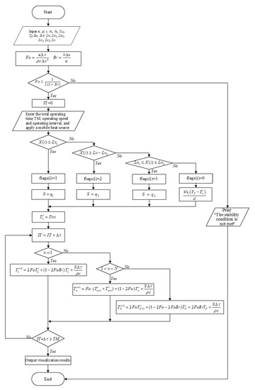 According to Equation (26), it can be seen that as long as the initial temperature distribution is known, the temperature distribution at other times can be obtained sequentially. However, the selection of space step size Δx and time step size Δτ follows the second law of thermodynamics, and the following stability conditions must be met: