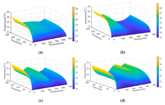 Comparing Figure 9b–d shows that the closer the nut heat source is to the bearing heat source at both ends, the higher the temperature of the bearing area and the operating interval after reaching a steady state. The heat generated by the bearing and the nut diffuses to the surrounding area and affects each other, causing the temperature to rise. Compared with Figure 9b,d, it can be seen that even if the nut heat source value is the same, the distance from the front bearing and the rear bearing is the same. However, the temperature distribution under the two conditions is only similar to the growing trend. The shape of the temperature distribution in the operating interval is different. That is because the structures and installation of the front and rear bearing are different.
