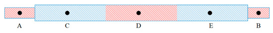 Select the midpoint of the heat source area on the surface of the screw shaft to represent the area’s temperature and observe the temperature change rules at different nodes. Node A represents the front bearing position, and node B represents the rear bearing position. Node C represents the position in the operating interval of 100 to 200 mm, node D represents the position in the operating interval of 100 to 400 mm and 200 to 300 mm, and E represents the position in the operating interval of 300 to 400 mm. The node position is shown in Figure 12. The temperature variation curves of nodes in the operating interval under different working conditions are shown in Figure 13.