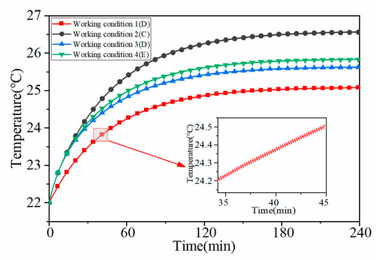 Nodes temperature change in operating interval under different working conditions.