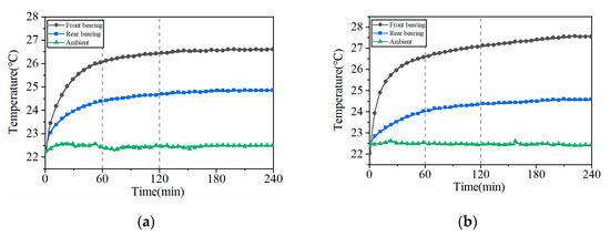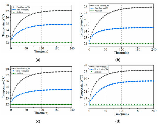 The temperature curves of the front bearing position node A and the rear bearing position node B with time are shown in Figure 14. It can be seen that before 60 min, the heat generated by the friction of each component makes the temperature of each node rise rapidly, and the temperature rise reaches 80% of the steady-state temperature. After 120 min, the heat generated by the component is gradually equal to the heat dissipated to the environment. The temperature rise rate gradually slows down to reach a steady state.