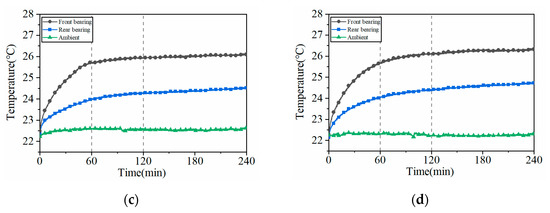 Temperature experimental results of the ball screw feed system under different working conditions: (a) working condition 1; (b) working condition 2; (c) working condition 3; and (d) working condition 4.