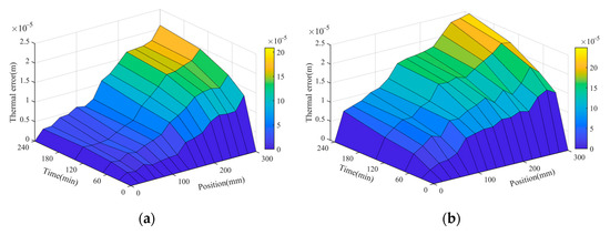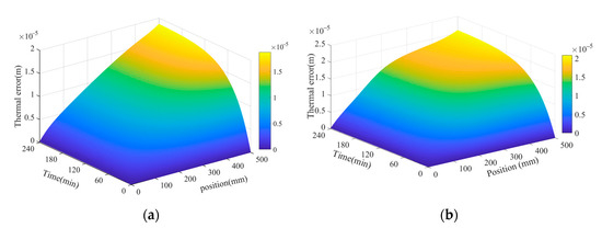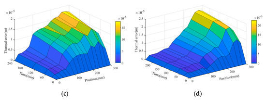 According to Figure 16 and Figure 17, it can be seen that the thermal error distribution in different operating intervals and different operating times will be different. At the beginning of the operation, there will be apparent changes near the curve of the heat source, showing a multi-section spline curve. In the later period of operation, the curve shows a linear curve. Therefore, when the thermal error is compensated, different compensation methods should be adopted in different operating intervals and different operating times.