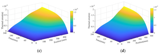 The established error model is used to calculate the thermal error of the ball screw feed system under different working conditions. The thermal error simulation results of the ball screw feed system under different working conditions are obtained in Figure 16. According to Figure 16, it can be seen that as the operating time increases, the larger the thermal error, and the further away from the front bearing position, the larger the thermal error. Due to the installation method of the screw shaft, the screw shaft expands to the end without axial restraint after being thermally expanded, causing the thermal error of each unit to accumulate to the rear bearing end. As a result, the thermal error becomes larger and larger farther away from the front bearing end.