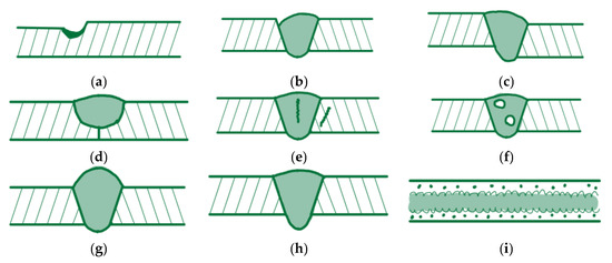 Laser micro-welding most common defects adapted from [38]: (a) End crater; (b) Underfill; (c) Misalignment; (d) Lack of penetration; (e) Cracks; (f) Porosity; (g) Excessive reinforcement; (h) Excessive penetration; (i) Spatters.