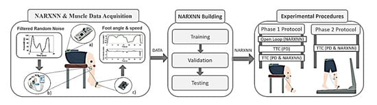 The present work is divided into three main steps, the (i) NARXNN and Muscle Data Acquisition, the (ii) NARXNN Building, and the (iii) Experimental Procedure, as demonstrated in Figure 1. The first step addresses the acquisition of foot angle and angular velocity data retrieved from the TA muscle stimulation modulating the stimulation pulse width using specific filtered random noise signals. The obtained data was subsequently used to train, validate, and test a NARX neural network model to create an inverse model of the TA muscle. In the last step, the NARX neural network performance was tested when incorporated into different control strategies under experimental procedures divided in two phases.