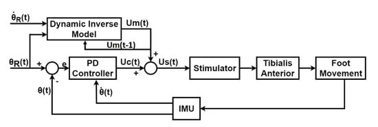 The first methods used to control FES devices to artificially induce motor tasks were feedforward open-loop controllers [5,6,7], which relied on manual parameter control, demanding high-cognitive effort for continuous FES use. There is a considerable evolution in the development of drop foot correction strategies based on FES since the first FES system was proposed in 1961 [8]. Recent research studies have proposed FES systems for drop foot correction based on inertial sensors [9,10,11]. In these studies [9,10,11], electrical stimulation was delivered through a closed-loop iterative learning control (ILC), which allows controlling dorsiflexion and eversion with respect to a given reference trajectory, adjusting the stimulation intensity between strides. Commercial drop foot systems available today still follow the same basic principle: detection of foot contact using a foot switch of an inertial sensor to deliver a square or trapezoidal pattern during the swing phase (e.g., the Odstock Dropped-Foot Stimulator produced by Odstock Medical Ltd. in the UK).