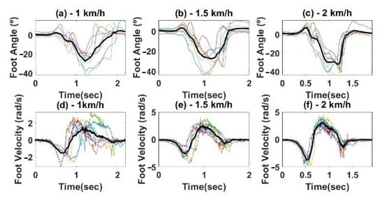 The foot reference trajectory was obtained from 10 healthy subjects walking on a treadmill at three different speeds (1 km/h, 1.5 km/h, and 2 km/h) as mentioned in Section 2.2. An IMU was placed on the subject’s foot to measure his/her kinematic behaviour. The foot angle and foot angular velocity were acquired in real-time during 10 gait cycles for each speed. Note that each gait cycle starts and begins when foot angle and foot angular velocity are 0° and 0 rad/s, respectively. For each walking speed, the foot angle and foot angular velocity reference trajectories were created by performing the average of the 10 retrieved signals, resulting in three-foot angle reference trajectories (Figure 5a–c) and three foot angular velocity reference trajectories (Figure 5d–f).