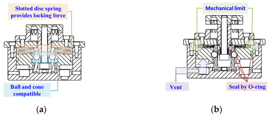 The whole structure of the quick-change fixture designed in this paper is divided into three parts as follows: component, fixed component, and locking mechanism, respectively. The schematic diagram of each part in two states of locking and unlocking after assembly is shown in Figure 1. The workpiece and other fixtures are connected with the following components. Fixed components are installed on the working plane (such as the lathe spindle). The following components and the fixed components are positioned through the end-toothed disc and locked by the locking mechanism. The internal structure diagram and design details of the fixture are shown in Figure 2. The locking mechanism adopts the method of steel ball and cone, and the locking force is provided by the slotted disc spring. The disc spring is used for its high stiffness and strong shock-absorption capacity. The axial space required by the disc spring is smaller than that of the ordinary cylindrical spiral spring, which reduces the impact caused by the centripetal force when rotating at high-speed.