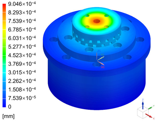 Four loading conditions, including locking force, gravity, rotation (1000 rpm), and torque (500), are simulated to explore the force of the designed quick-change fixture. Additionally, a pressure of 400 N (greater than 341 N) is applied to the locking slider when the locking force is applied. Only the rotation freedom of the base bottom in the z-direction is released, and the other five freedoms are restricted so that only freedoms of movement in the z-direction and rotation of the locking slider are allowed. At the same time, other parts are connected by surface adhesion according to the assembly relationship. The deformation contour of the model under the coupling action of the four loading conditions above is shown in Figure 7, in which the maximum deformation occurs at the center screw hole of the upper-gear disc, and the maximum deformation is about 0.9 μm. From the point of view of clamping-force-induced deformation, the introduction of the designed quick-change fixture has a trivial impact on the machining accuracy of the parts.