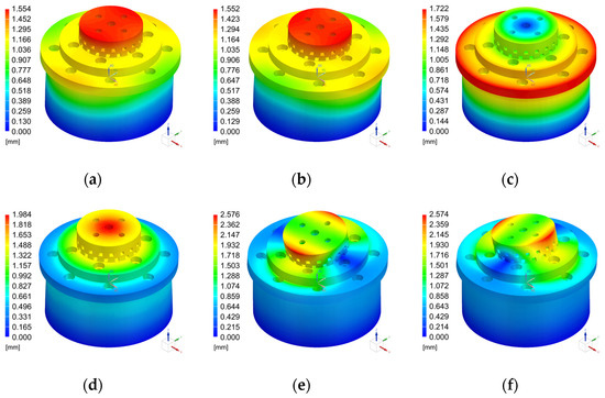 The deformation contour of the first six modes of the model. (a–f) Mode 1–6, and their natural frequencies are 5655.9, 5659.82, 10,474.1, 11,072.5, 14,147.6, and 14,155.0 Hz, respectively.
