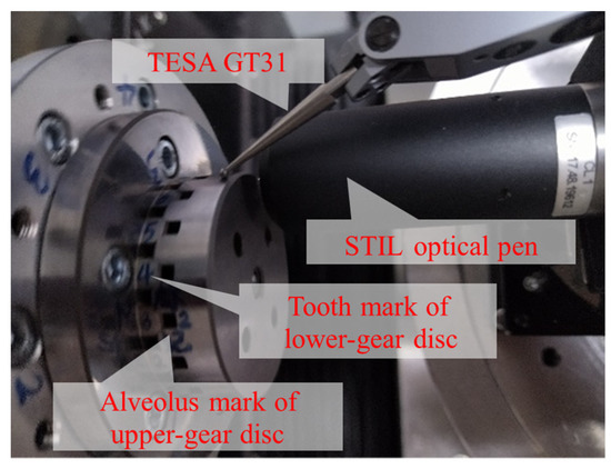 Since this paper focuses on the repeatable positioning accuracy rather than the positioning accuracy, and considering the time and economic cost of the processing, the initial design of the meshing height error of the end-toothed disc is chosen as 5 μm. According to the above analysis, the meshing height error assigned to the cumulative pitch error, tooth direction error, and tooth profile half-angle error is , , respectively. Then, the maximum allowable errors can be obtained from Equation (4):