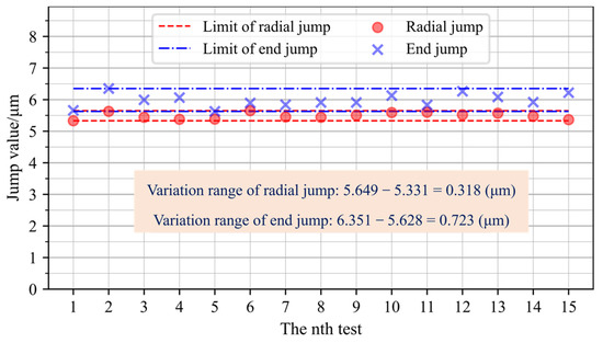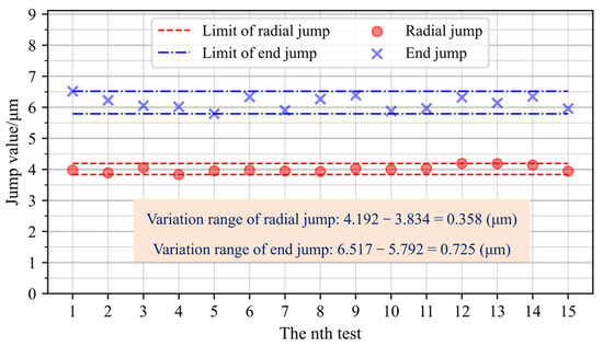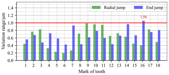 The group 1 experiment used the same pair of end-toothed discs (upper-gear disc 1 and lower-gear disc 1) to cooperate with each other. Firstly, the repetitive positioning accuracy of the two toothed discs in the same meshing position (hereinafter referred to as repeated clamping after non-rotating) is tested. The marked tooth groove of the upper-gear tooth disc 1 is randomly selected to match with the tooth marked 4 of the lower-gear disc 1, and the toothed disc is matched in this position every time for repeated clamping. The results after 15 repeated clamping actions and tests are shown in Figure 12. It is seen from Figure 12 that when the same pair of gear disks are matched and the meshing position is relatively unchanged, the variation range of the clamp’s radial jump value and end jump value of the fixture is less than 1 μm after repeated clamping. Then, the run-out of the upper-gear disc is tested when there is relative rotation at the meshing position of the two gear plates (hereinafter referred to as repeated clamping after rotating).
