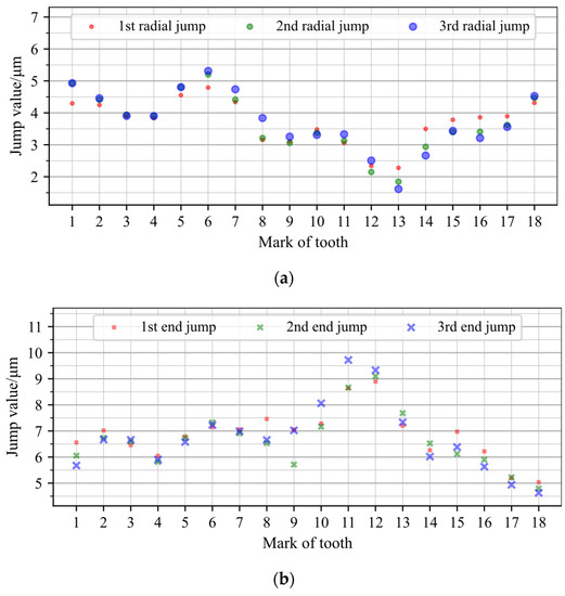 Test results of experimental group 3 after tooth rotation. (a) Radial jump; (b) end jump.