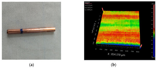The finished workpiece and its test result. (a) Picture of the cutting copper bar; (b) surface morphology characterized by white light interferometer.
