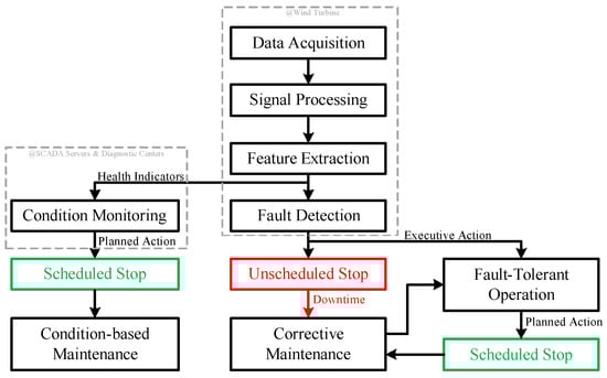 Figure 1 shows that CM and FD start at the turbine level with a conceptually similar process flow, where health indicators are derived from various sources (sensors, controllers, and CM system) at relatively high sampling rates. CM continues at supervisory control and data acquisition (SCADA)/cloud servers and diagnostics centers, where methods are deployed for failure prognosis. As a result, service actions are planned as per the predicted time of failure, preventing unscheduled stops and reducing downtime. FD runs at the turbine for fast executive actions—in parallel with CM, triggering either a stop or a fault-tolerant operating mode. Thus, downtime can be avoided only if the drive train component being monitored is endowed with fault-tolerant capabilities, which may allow uninterrupted operation or an unscheduled stop of short duration. Fault-tolerant operation may be initiated automatically by means of software reconfigurations (e.g., changing operating limits), or manually after corrective maintenance takes places (e.g., disconnections of faulty circuits). However, the design of fault-tolerant systems may impact cost and performance of a wind turbine, making these approaches less attractive.