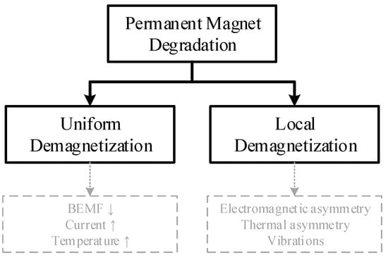 Demagnetization is another important type of faults for PMGs, which failure mechanism is shown in Figure 4. Having insured high production quality, operational stresses are of extreme importance for the performance of PMGs, since exceeding temperature and current limits can cause irreversible demagnetization. Demagnetization can be partial or uniform, each showing distinct fault signatures due to changes in back-emf harmonics and fundamental amplitude, respectively. The variation of the magnetic saturation of the stator core is the signature exploited in [60,61].