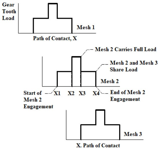 The abscissa in Figure 1 represents the contact path and serves as a simple coordinate system for computing gear meshing losses. As three sequential pairs of gear teeth come into contact, Figure 1 shows the assumed immediate gear tooth loading. The sites where teeth enter or depart a meshing cycle are indicated by the coordinates on the route of contact. The instantaneous contact point between two mating gear teeth maps out the path of contact, which is actually a line in space with a set inclination (the pressure angle).
