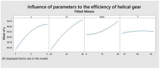 According to the PBD experiment, the most influential elements on gear efficiency μ were torque T (x7), helix angle β (x4), gear ratio u (x2), and tooth number z (x3). These parameters should be explored further using full fractional designs and more advanced methods such as response surface methods, if necessary. In the next stage of experimentation, one should analyze the interactions between the torque T, tooth number z, gear ratio u, and helix angle β, while setting the unimportant factors at their most economical levels.