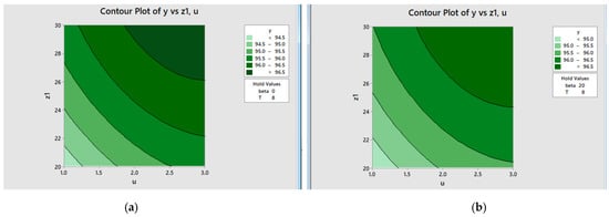 Contour plots of the efficiency of helical gear dependent on ratio u and number of teeth z1: (a) gear data: β = 0 and T = 8 N∙m; (b) gear data: β = 20° and T = 8 N∙m.