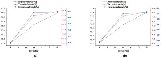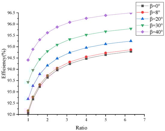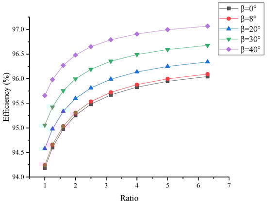 From the above results (Equation (23)), we find that the highest gear efficiency is 0.975252 when the ratio is u = 2.8182, the number of teeth is z1 = 30, the helix angle is β = 30°, and the torque is T = 32 N∙m; the lowest gear efficiency is 0.939146 when the ratio is u = 1, the number of teeth is z1 = 20, the helix angle is β = 0, and the torque is T = 32 N∙m.