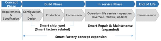Hyundai Heavy Industries, Daewoo Shipbuilding & Marine Engineering Co., Ltd., and Samsung Heavy Industries are the three major global ship manufacturers in Korea that lead smart ship and yard constructions by applying the new technologies of the fourth industrial revolution and utilizing IT systems []. In the report by SPAR Associates. Inc., which have been serving in the shipbuilding and repairing industry for over 45 years, about 23% of the total cost is ship acquisition cost, approximately 35% is labor cost, and the remaining 42% is repairing and maintenance in the Naval Ship Life Cycle Cost (LCC) Model []. Although the growth of a smart factory is limited to the ship building phase, shipbuilders are interested in further expanding the smart factory concept to the service phase in order to expand the scope of the maintenance, repair, and operations (MRO) business. It is necessary to expand the research on manufacturing-oriented smart factory research to cover the entire lifecycle.