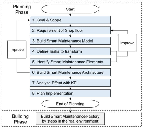 As suggested in previous studies, starting on a small scale [,] or limited area [] seems to be an effective way to minimize risk, but there may be situations in which it is stopped or scaled down due to various obstacles in the process. Procedures for smart conversion of specific tasks are limited in their application of transforming the entire plant. Few studies suggested a method for the procedure for building a smart maintenance factory in the field. We developed a hybrid procedure that combines the top-down procedure that presents the future image and goals of a smart maintenance factory and the bottom-up procedure that reflects on the site conditions and requirements for changes. After approximately one year of revision and improvement, this procedure was eventually developed as shown in Figure 3