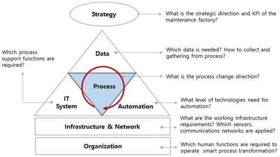 While the traditional approach derived the necessary elements of data, system, and automation through the direction of process change, the smart process transformation framework in this study intends to lead process change through actual technologies of the fourth industrial revolution. In addition, based on long-term field analysis and opinions from site workers, this study identified that data, IT systems, and automation (technology) take the lead in major changes in smart maintenance plants and thus reflected them in the framework.