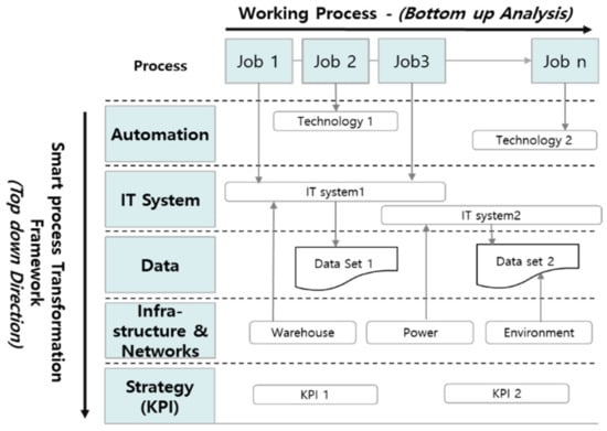 The template consists of the working process on the horizontal axis and the smart transformation framework shown in Figure 4 on the vertical axis. The requirements for jobs constituting the process are classified and organized into automation, IT system, data, operating infrastructure and communication network, and strategy. Automation describes smart technologies and equipment needed for smart transformation. In the IT system, the requirements and functions of the operation support system that support the job are described. Data describes the required data set and format. Support infrastructure requirements such as warehouse and power system are described as infrastructure, and requirements for sensors and communication networks are described in network. Strategies are described in connection with improvement effects in each job and KPIs. In addition, deletion, and integration of jobs in the process are also described.