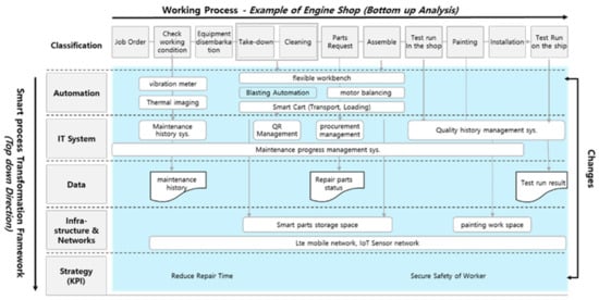 The requirements of transforming each workplace of the maintenance factory to a smart factory are analyzed for selecting tasks to be improved. Such transformation requirements are handled systematically based on the smart process transformation framework developed. The characteristic of the smart process transformation framework presented in this study is that it leads to changes in the repair and maintenance process through the following three elements of smart transformation: data, system, and automation (technology).
