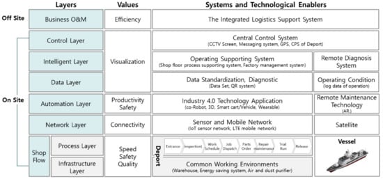 In the automation layer, productivity and safety are focused. It is composed of industry 4.0 technologies applicable to each workplace to secure safety and productivity. The network layer emphasizes connectivity for collecting data and sharing information of workers and materials through wireless and wire. The remote maintenance is connected to the vessel via satellite.