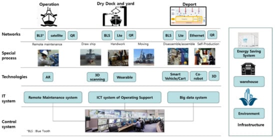 In order to expand the smart factory concept to the service phase, practical application research, and applications were emphasized [,,]. The difficulties in applying the concept of a production-oriented smart factory to a smart factory in the maintenance area were discussed by site workers. The staff of vessel maintenance depot stated the limitations in applying smart factory to the field of repair and maintenance sector. “Despite the rapid growth of technology due to the fourth industrial revolution, smart factories are applied in the maintenance field, not the manufacturing field, but in reality, there are technical limitations. Since nobody has ever done it, no one has been able to strongly suggest to what extent it should be specified or what is needed to realize the future of the smart vessel maintenance depot. [], (p. 30).”