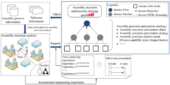 In this paper, a structuralized modeling and reasoning framework based on ontology is presented for assembly precision optimization, which is used to build the semantic association model between engineering semantic knowledge and assembly precision optimization. Firstly, the assembly precision optimization semantic model was constructed based on multilevel descriptors, which were logically divided into the assembly precision analysis results, the out-of-tolerance key characteristics, and the assembly process and design tolerance adjustment. The results of the assembly precision analysis, the out-of-tolerance key characteristics, and the adjustment of the assembly process and design tolerance are related. Then, according to the accumulated effective engineering experience, the corresponding relationship between the assembly process capability index and the assembly process optimization is established. At the same time, the instantiation assembly model data are represented structurally based on ontology mapping. The main contributions of this research are as follows.