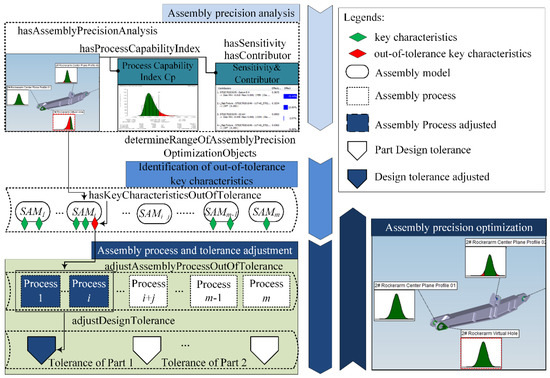 According to the assembly precision optimization principle, the information of assembly precision optimization can be organized as a semantic model, as shown in Figure 6. According to the results of assembly precision analysis, the process capability index, sensitivity, contributor, and other data are obtained to be used as an important basis for assembly precision optimization. The optimization range is determined according to the out-of-tolerance key characteristics. Different precision optimization strategies are adopted according to different ranges of process capability indexes. On the premise of satisfying the process capacity of the enterprise, the process optimization is given priority to achieve the balance between production cost and process capacity.