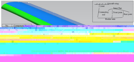 The effectiveness of the proposed approach is verified by an example of an aircraft inner flap. Because the inner flap is the key component of the aircraft, which plays a decisive role in the take-off and landing performance of the aircraft, the requirements for assembly precision are higher. The structure of the inner flap is shown in Figure 7, which is mainly composed of sliding rail, rocker arm, leading edge, middle segment, and trailing edge, including front and rear beams, torsion tube, slide rib, end rib, common rib, upper and lower wing surfaces, rocker arm joints, etc. When the inner flap rotates, the connecting rod provides power to drive the rocker arm, which drives the inner flap down through the front and rear joints.