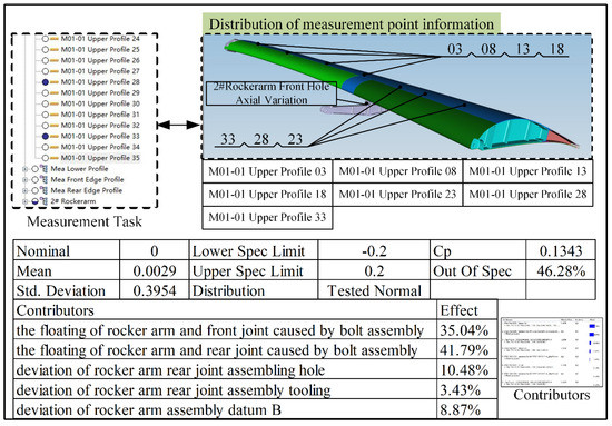 - The Monte Carlo algorithm is used to calculate the cumulative results of assembly deviation. In order to make the statistical result closer to the true value, 5000 groups of random deviation values are taken for assembly precision analysis. The final assembly precision analysis result is shown in Figure 8. According to the result of the inner flap assembly precision analysis, the axis deviation of the rocker arm front intersection hole is out of tolerance, and the distribution of axis deviation is shown in Figure 8, in which the Cp of the key characteristic is 0.13. According to Table 3, the process capacity level of the key characteristic is seriously insufficient. The optimized assembly process information should be determined according to assembly deviation source impact factors so as to realize the assembly precision optimization of the front intersection hole axis deviation of the rocker arm. According to Figure 8, it can be seen that the main influencing factors of the front intersection hole axis deviation are: the floating of the rocker arm and front and rear joints caused by bolt assembly, deviation of the rocker arm rear joint assembling hole, deviation of the rocker arm rear joint assembly tooling, and deviation of the rocker arm assembly datum B.