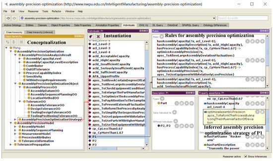 - According to the inference machine Hermit of Protege software, the results show that the assembly process needs to be reformed for achieving assembly precision optimization and meeting the requirements of assembly precision, as shown in Figure 9. The positioning mode of the front and rear joints and the deviation of the front and rear joints positioning tooling are the first targets to be optimized. The upper semantic framework of the proposed method is established through conceptualization. Next, concrete instances are built based on the defined concepts for semantic instance modeling of the analyzed products. The inference rules applicable to Protégé are established according to the SWRL rules mentioned in the third section. Finally, the inference result is obtained by running the inference machine, and the strategy for assembly precision optimization is obtained.