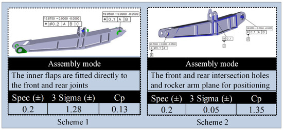 - Before the optimization of the assembly process, the rocker arm and inner flap are assembled directly through the front and rear joints, which is conducive to the interchangeability of parts, as shown in Figure 10 (Scheme 1). In order to ensure assembly precision of the front intersection hole of the rocker arm, the front and rear joints of the rocker arm are assembled with tooling to directly locate the intersection hole of the parts and the surface where the intersection hole is located. The rocker arm positioning mode is changed to the front and rear intersection holes and rocker arm plane positioning, as shown in Figure 10 (Scheme 2). Through the optimization of the assembly process, the ±3σ value and Cp value are, respectively, 0.05 and 1.35, which are within the target range of assembly process optimization, indicating that assembly process optimization has realized the precision optimization target of the front intersection hole axis deviation. A comparison between the original assembly process scheme (Scheme 1) and the assembly process optimization scheme (Scheme 2) is shown in Figure 10.