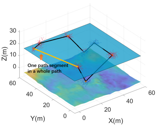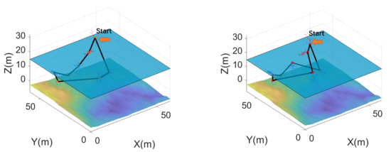 Recall that for each path segment between and , there are four possible types of mission environment. The energy cost differs when the HAUV is moving underwater, aerially, and transitioning between the two. According to the experimental data, we can assume the energy cost of the HAUV moving underwater is five times that of flying per meter. Let be the energy weight of the HAUV moving one meter underwater, and equals 5. Under such situations, the HAUV can be regarded as a particle, whereas its length must be considered when it switches medium. Figure 8a,b gives a comparison between an output path with a weighted edge and a path without a weighted edge. In the latter situation, the HAUV may choose a shorter path but with a higher energy cost.