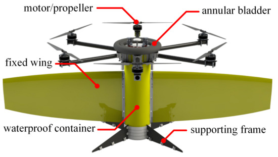 The HAUV discussed in our work is an integration of fixed-wing UAVs, rotary-wing UAVs, and UGs [8]. Details are illustrated in Figure Figure 2. The mass of the HAUV is 15 kg, each wing is 750 mm * 300 mm, and the length of the glider is 1000 mm. The main structures of the HAUV are fixed wings, rotary wings, and a waterproof container.