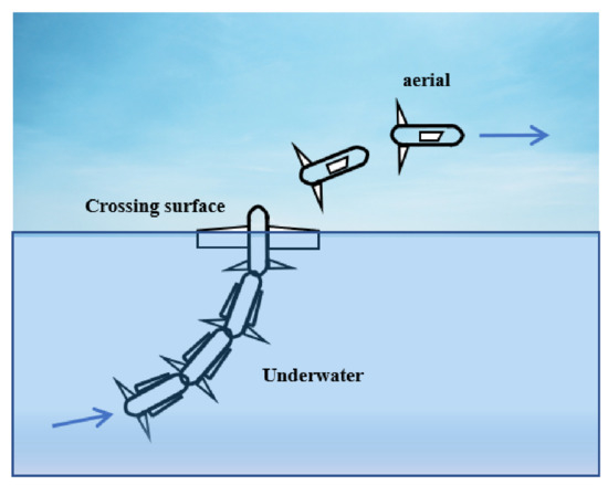 Since the HAUV can move both underwater and aerially, the motion modes of the HAUV can be divided into three categories: underwater, aerial, and transitioning (between water and air). Figure 3 illustrates the motion of the HAUV.