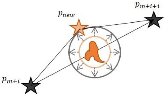 Obstacle avoidance strategy: extend the outer circle of obstacles to and find a free point set on the circle. If there is no solution found, must be extended again.