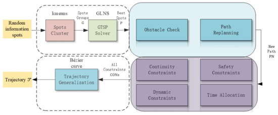 The framework of the whole algorithm is shown in Figure 6. The input the presented framework is scattered informative spots. Through the heuristic GLNS and k-means solver, the spots are clustered, and the path planning is described in Section 3.1. Then in Section 3.2, whether unknown obstacles exist is solved, and replanning is explained for path segments that pass obstacles. The trajectory regeneration based on that path found in the former section is explained as well.