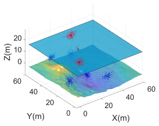 To simulate the target motion space, we can randomly create m spots. Both the number of spots and the positions must conform to a Gaussian distribution. When passing through the target space, the HAUV has to sample or move to some spot of scientific relevance. Therefore, a target spot should be selected from all the information spots. Since all the terrain map is fixed, KD tree stores the environmental information to enable quick reactions to the NNS problem. An example of this information mapping is in Figure 7.