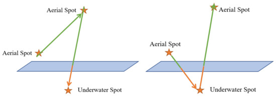 Four types of trip according to the HAUV’s mission mode. A blue arrow illustrates an underwater path, and an orange one means an aerial one. Regarding when the trip crosses domains, the intersection point on surface will be inserted into the target spots set.